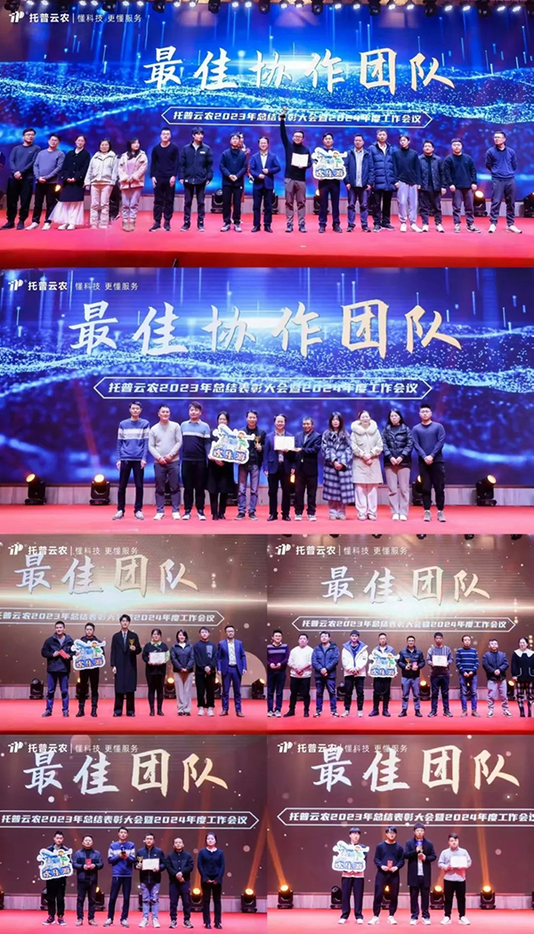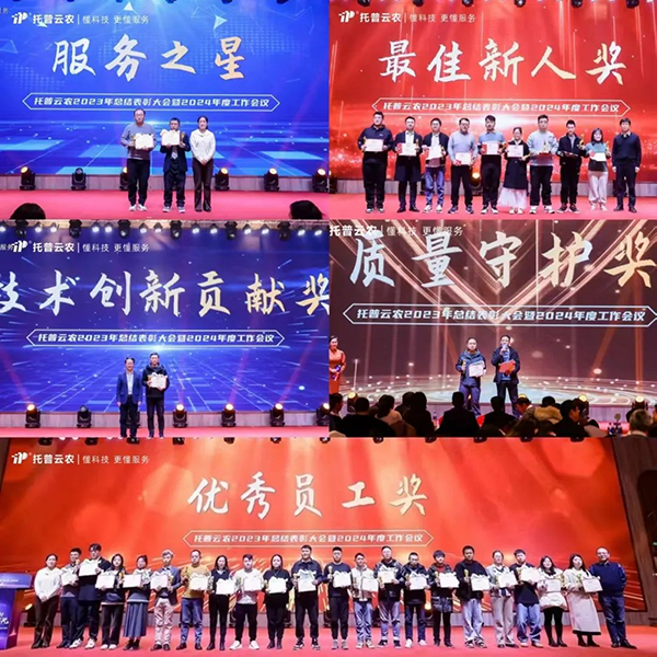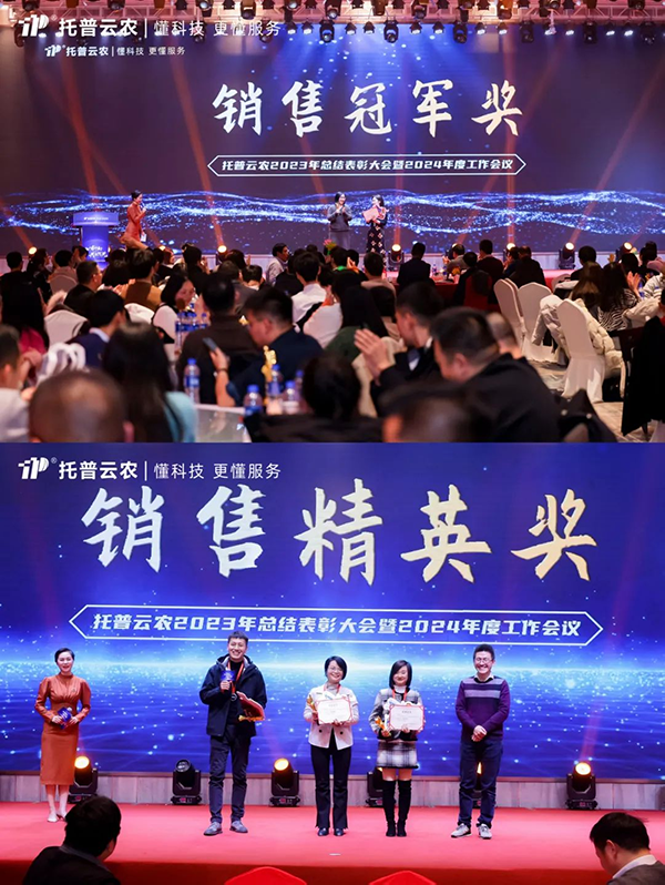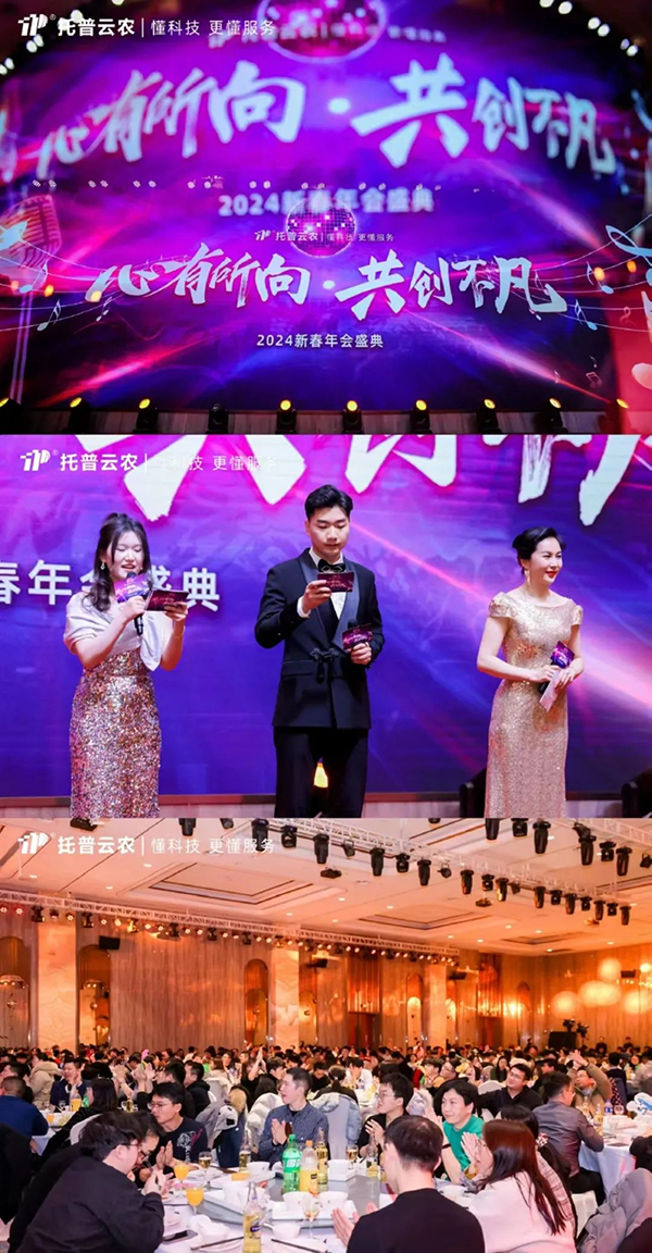 陈渝阳董事长向全体线上线下托普人表示衷心感谢,向年度优秀获奖代表表示祝贺,并作2024战略发展规划。他表示,乡村振兴上升为国家战略,产业兴旺和农业现代化是乡村振兴战略的重要依托,为行业发展带了诸多机遇。但百年变局仍在高速演变,市场竞争日趋激烈,内外部环境错综复杂,给企业和行业发展也带来了诸多不确定性。面对行业高质量发展的需求,我们要厚植根基、做好当下,以实力应危机,才能实现韧性生长、突出重围。2024,企业将继续坚持“科技创新驱动”发展战略,引进人才,布局核心产品和解决方案,打造企业核心竞争力。强化内外部生态协同、创新协同,向内深化融合,向外构建产业、科研、技术合作生态,推动企业保持行业引领地位。以“两确保三提升两强化”行动,实现产品竞争力和企业运营效率的提升,为客户提供优质服务。