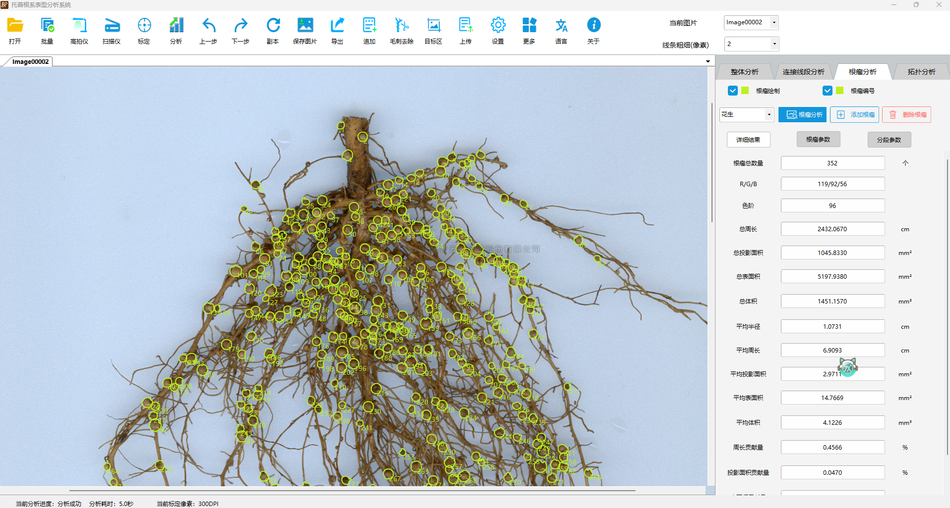 2.拓扑分析:单独地自动分析主根及其分支侧根的长度和分叉数等,指定主根后,在明确的拓扑关系下,能自动分析各级侧根。